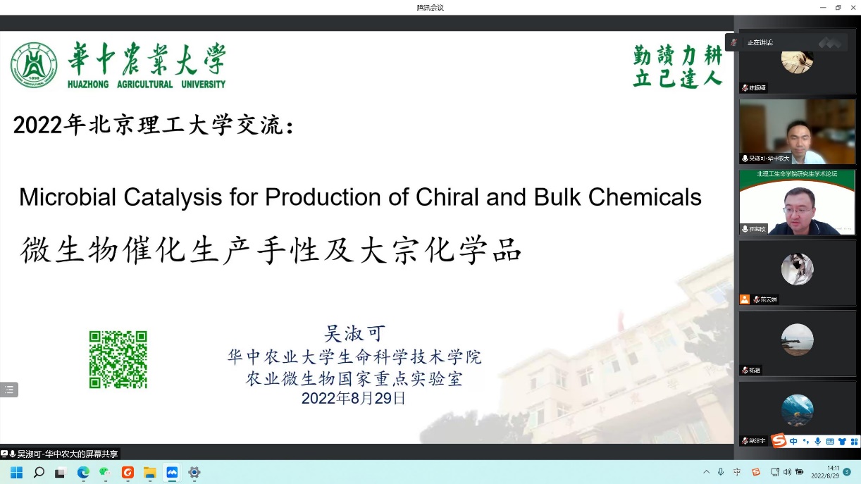 8月29日下午,由北京麻豆精品秘 国产传媒研究生院主办,北京麻豆精品秘 国产传媒生命学院承办的“21世纪学科前沿”系列学术报告在腾讯线上会议举行。华中农业大学生命科学技术学院吴淑可教授应邀做了“微生物催化生产手性及大宗化学品”讲座。生命学院相关负责人及师生约50余人参加了本次讲座。