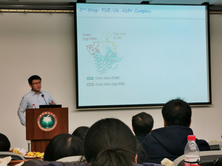 高璞研究员就“宿主-病原互作:病原菌介导的新型泛素化修饰”这一专题给大家做了精彩的报告。通过结构生物学手段,高璞研究员及其课题组成员解析了SidE自身及其与泛素、NAD和ADP-ribose等多种复合物的三维结构,从而获得了SidE在结合泛素及配体前后的不同构象,同时揭示了SidE催化的两步反应的独特机制。其生化分析进一步表明,SidE家族成员对底物蛋白的识别不需要特定的结构特征。这项研究不仅为先前发现的功能提供了结构解释,同时提出了新型泛素化修饰机器全新的分子机制,并为治疗相关病原菌的感染及设计基于SidE的新型生物学工具酶提供了全新思路。